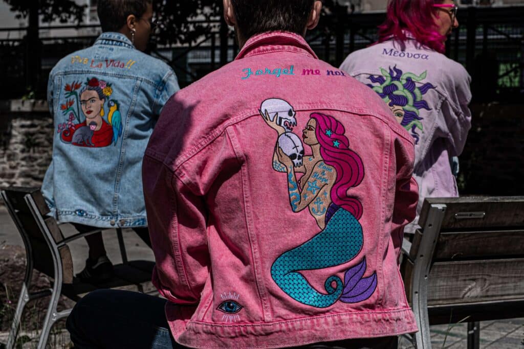 Je travaille à partir de vêtements recyclés ou vintage et les transforme par broderie, dans une logique d’upcycling. Cela a deux conséquences : une réduction de l’impact environnemental, et l’élimination des codes genrés traditionnels (coupe femme / homme) qui souvent génèrent des productions séparées, donc des sur-stocks, des déchets. Proposer un modèle unisexe, c’est simplifier la production, limiter le gaspillage, éviter de cloisonner le public et les inventaires. C’est donc cohérent avec l’engagement durable de la marque.