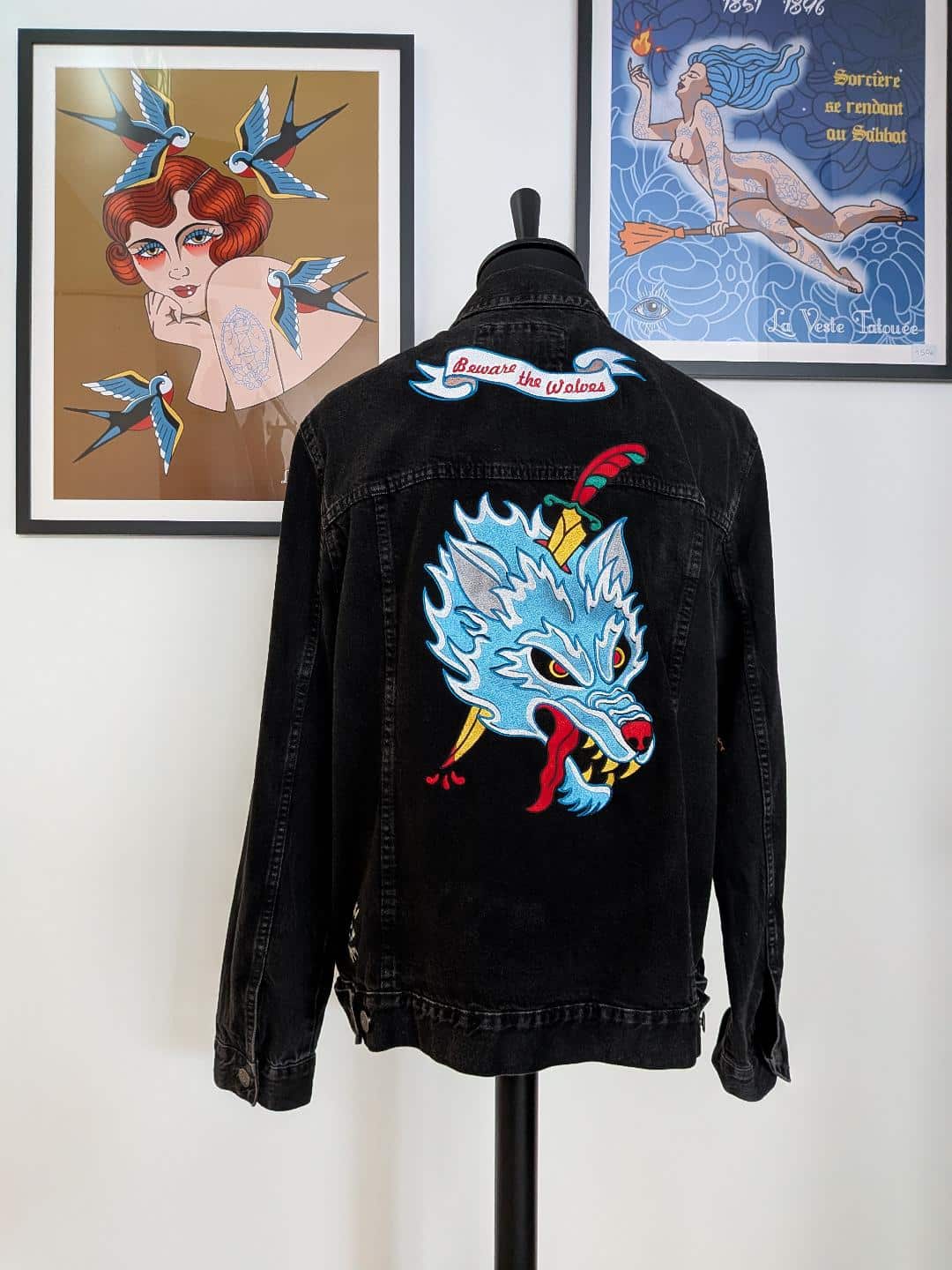 Les broderies du dos (loup + bannière) sont composées de plus de 150 000 points de broderie et leur réalisation prend + de 3 heures !