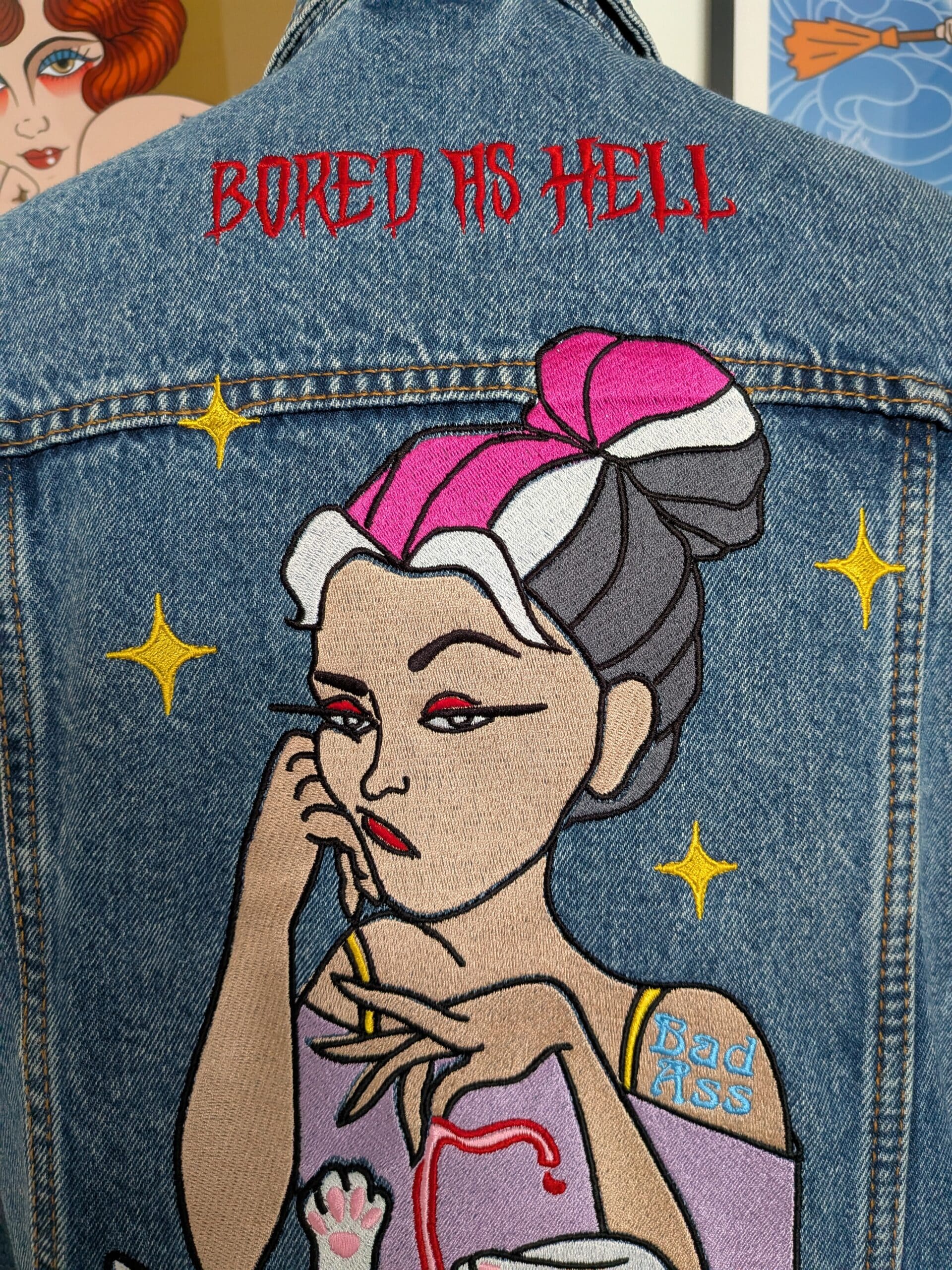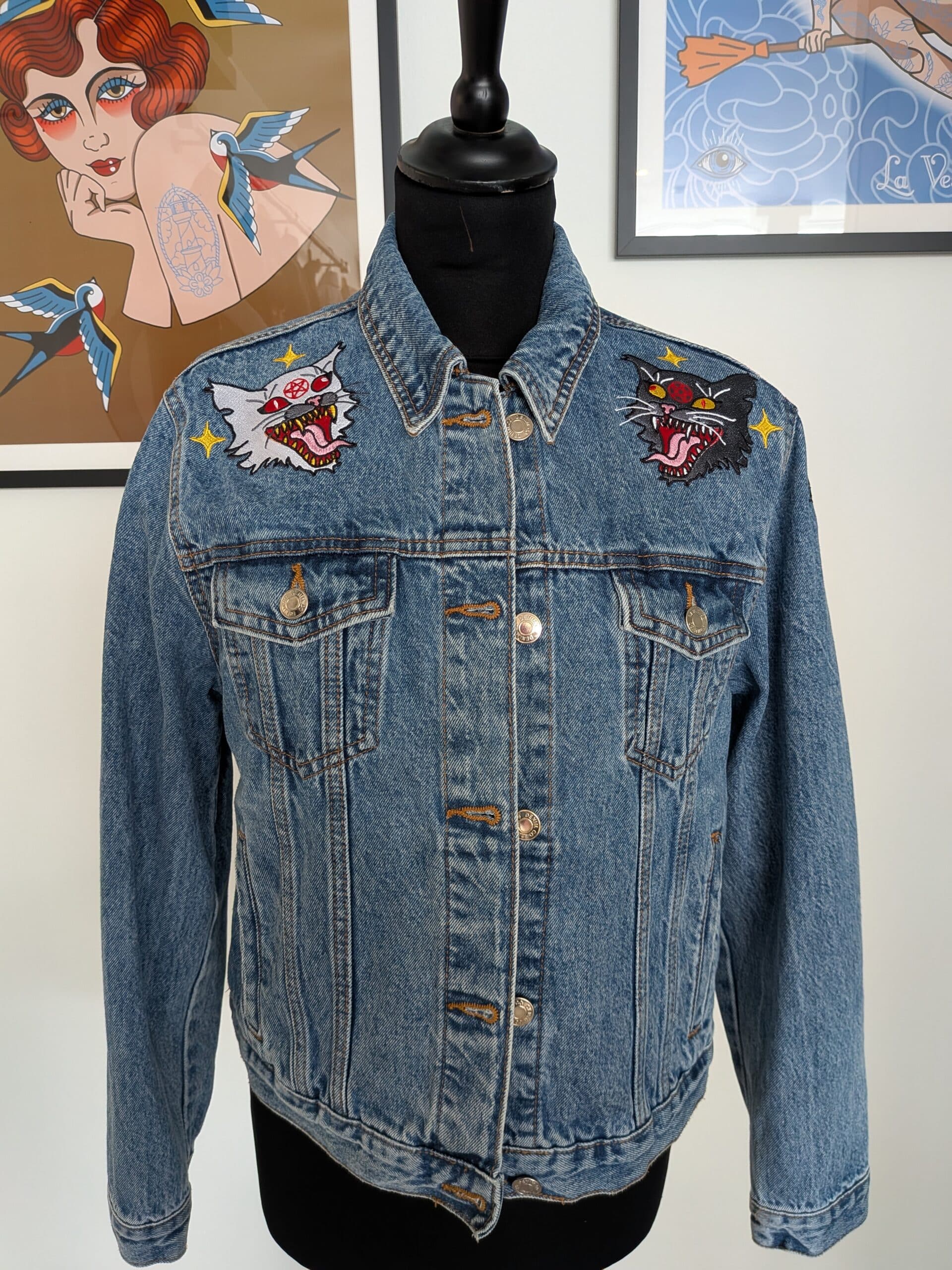 Veste vintage en denim dégotée en friperie et embellie de broderies inspirées de l’univers du tatouage.