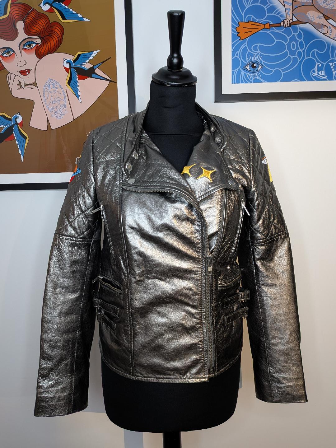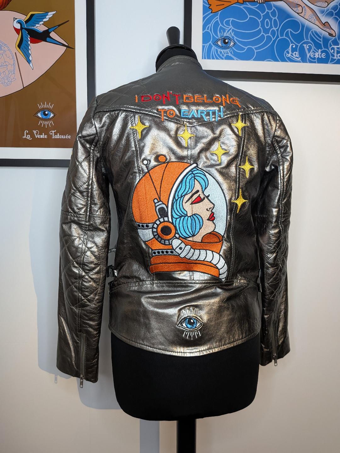 L’astronaute, dans l’univers du tattoo est aussi le symbole des personnes braves et courageuses et sur cette perle de veste en cuir argenté c’est un total look !!