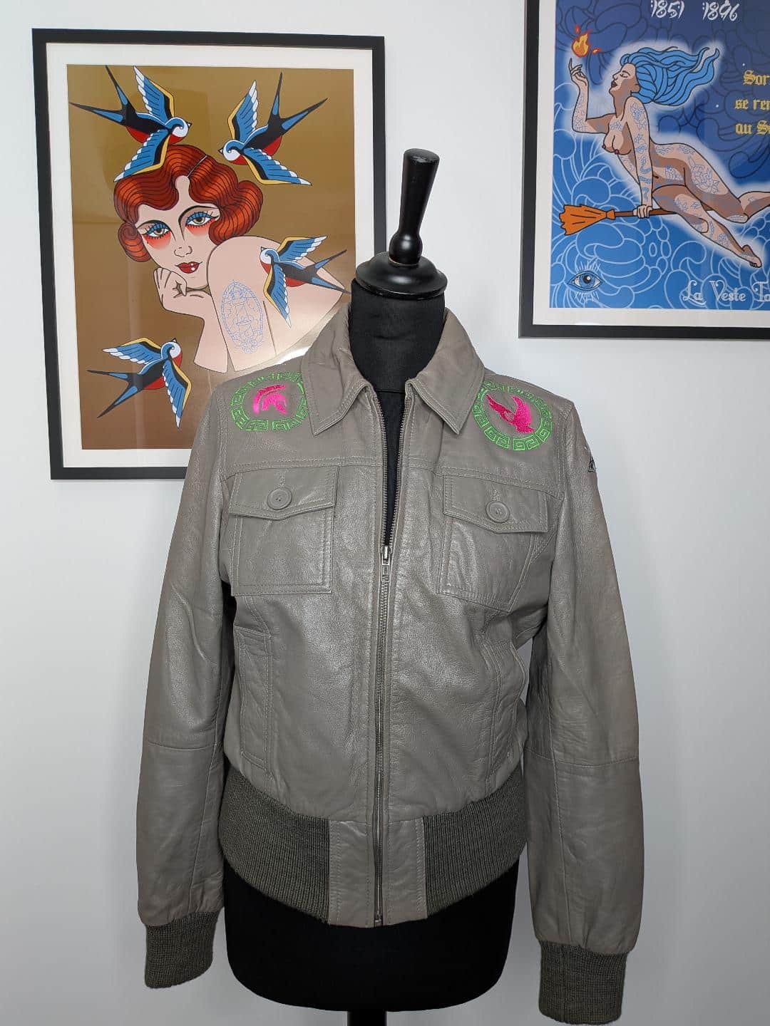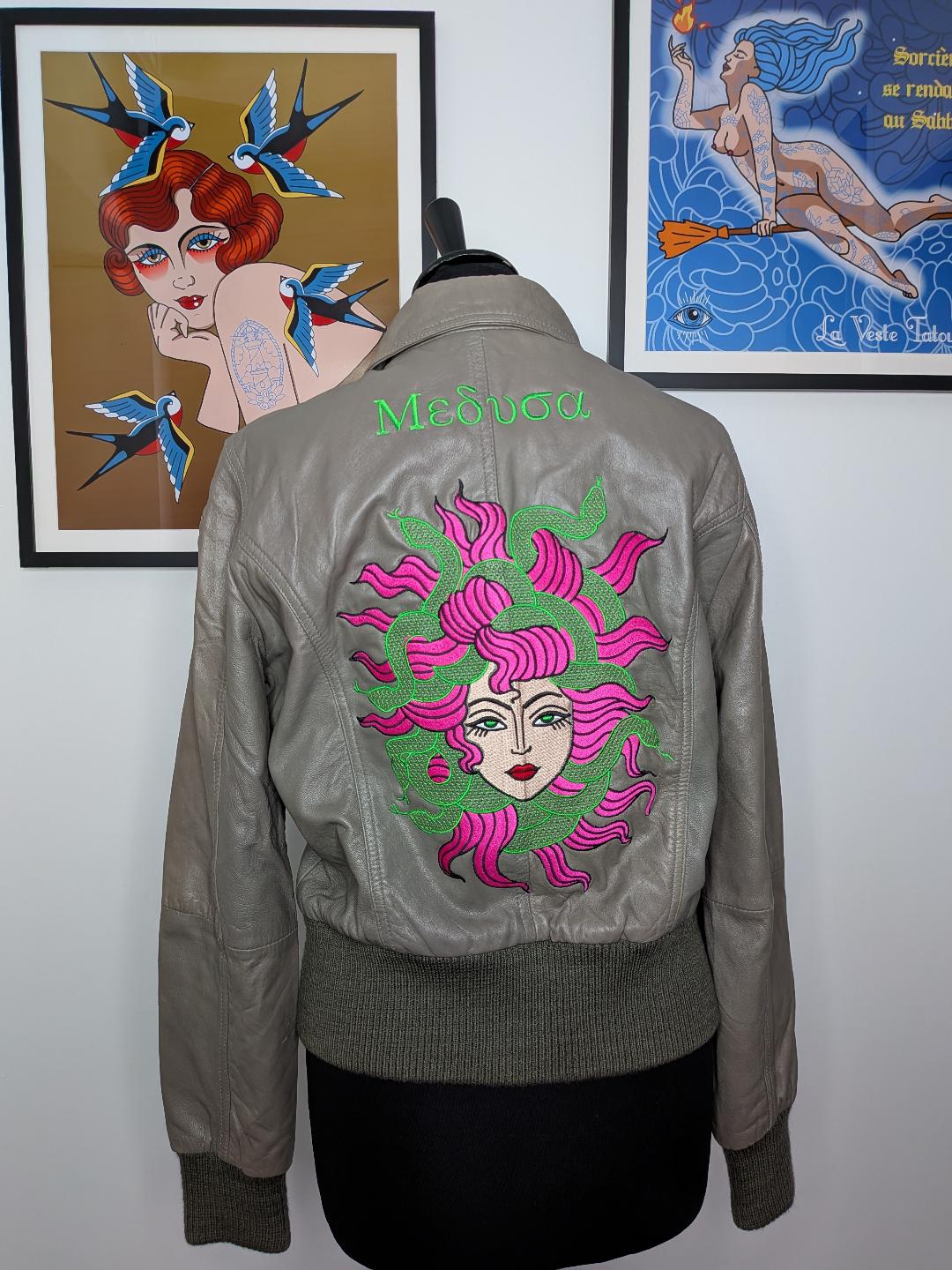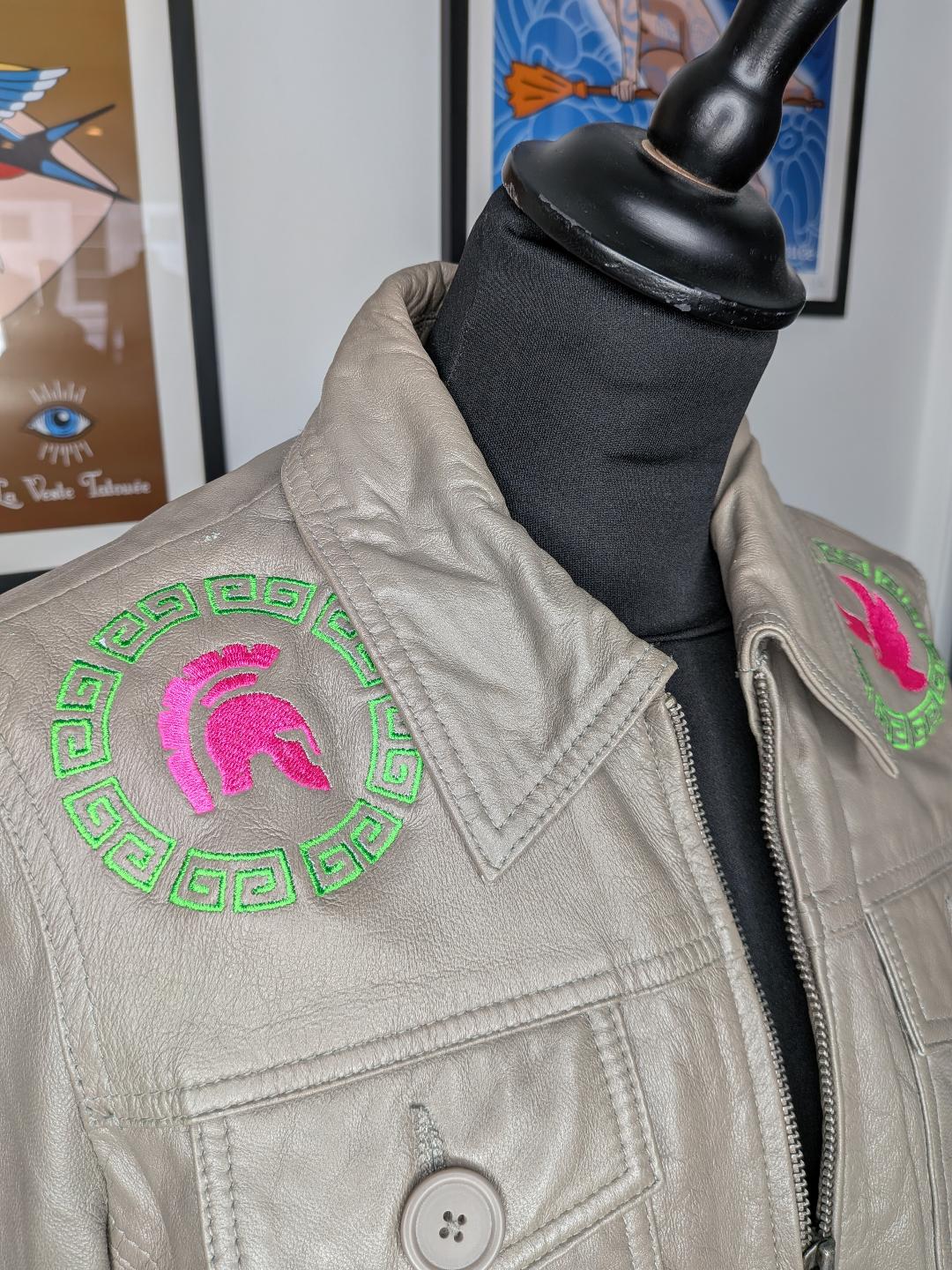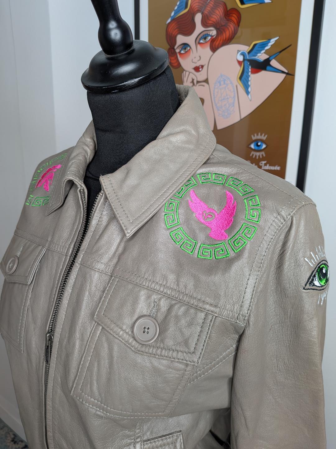 Comme sur toutes les vestes, le logo Evil eye de La Veste Tatouée est également brodé. Sur cette pièce unique, il est brodé sur l’épaule gauche.