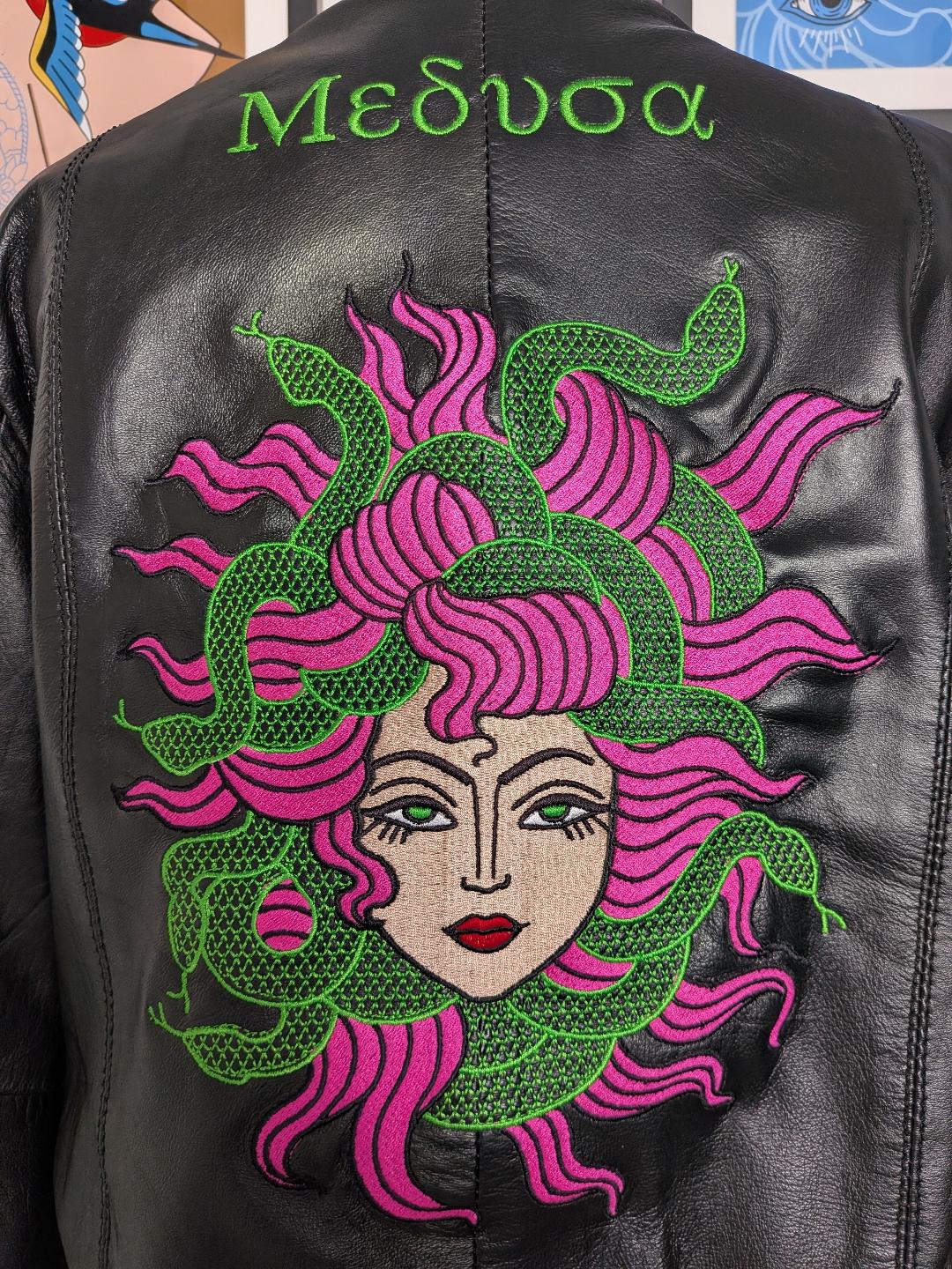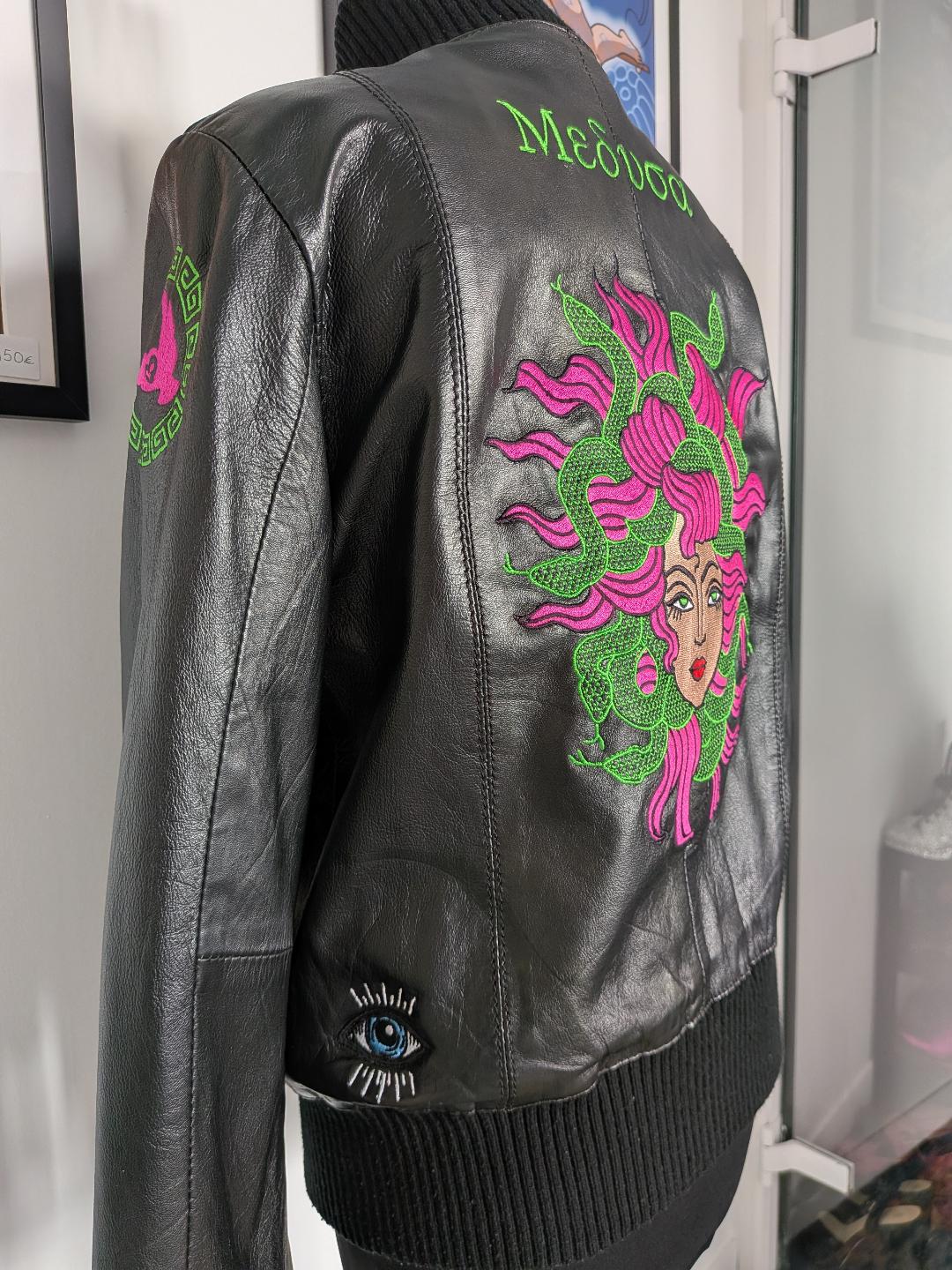 Sur cette veste en cuir souple, découvrez un visage dont les yeux ont le pouvoir de pétrifier tout mortel qui croise son regard.
