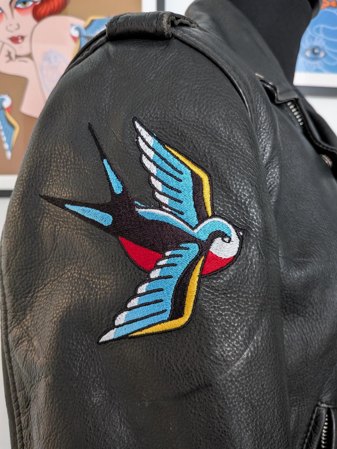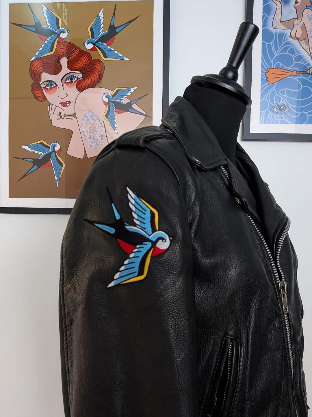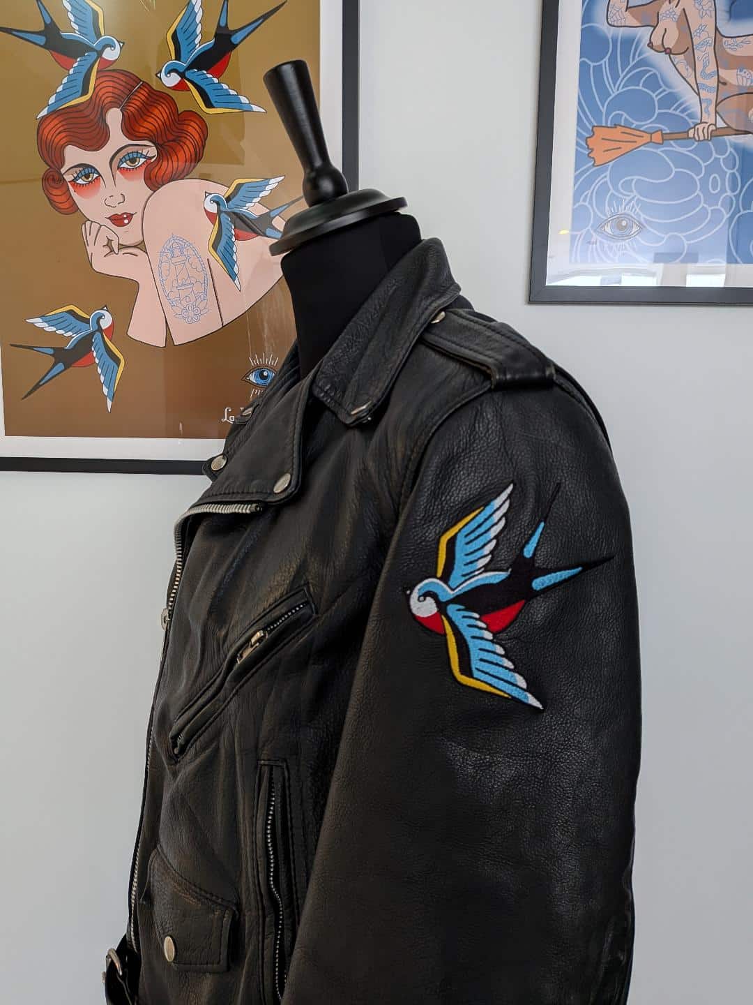 Sur les épaules du perfecto, retrouvez deux hirondelles, symbole d’espoir et de bonne fortune.